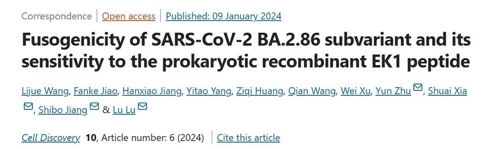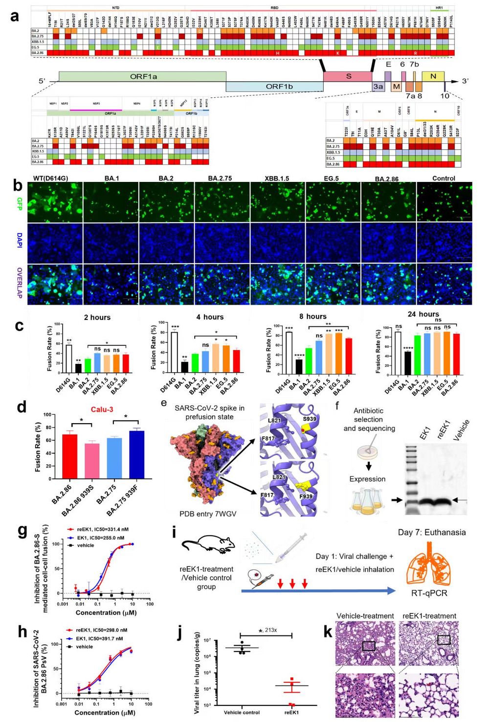 近期,复旦大学基础医学院医学分子病毒学教育部/卫健委/医科院重点实验室、上海市重大传染病和生物安全研究院双聘PI陆路/姜世勃/夏帅团队通过对BA.2.86膜融合动力学的分析,揭示了该病毒的膜融合特征。同时,该团队将其在前期开发的通用冠状病毒融合抑制剂多肽EK1(现在II/III临床试验中)通过原核表达技术进行制备,所产生的多肽——reEK1具有广谱、高效的抗病毒活性,还具有可大规模生产且成本较低的潜在优势,对当前新冠病毒或未来可能爆发的其他冠状病毒引发的大流行传染病防控提供了药物研发新思路。该研究成果于今年1月9日发表在Cell Discovery。