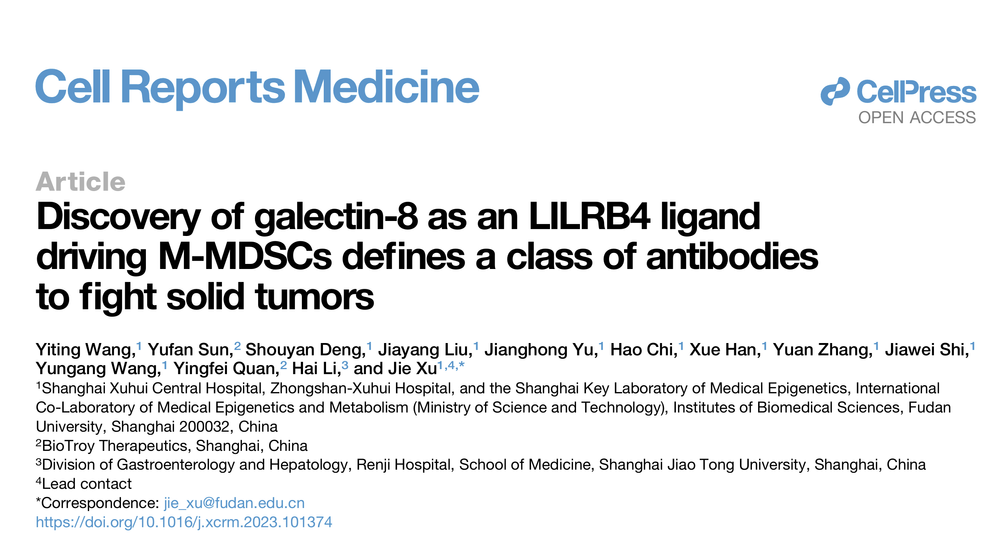 2024年1月16日,复旦大学生物医学研究院许杰课题组在Cell Reports Medicine杂志上发表了题为“Discovery of Galectin-8 as an LILRB4 ligand driving M-MDSCs defines a class of antibodies to fight solid tumors”的文章,该研究首次报道了Galectin-8作为LILRB4的肿瘤相关功能性配体,通过下游的STAT3和NF-κB通路来诱导M-MDSC,从而促进免疫抑制和肿瘤的生长,并研发了具有阻断功能的治疗抗体,证明了阻断Galectin-8与LILRB4的抗体能够减缓多种高表达Galectin-8的肿瘤在小鼠体内的生长,具有潜在治疗和转化价值。