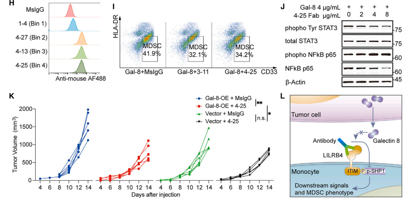 通过分别开发了抗LILRB4抗体和抗Galectin-8抗体,研究者证明了双向阻断均能够抑制Galectin-8和LILRB4作用带来的效果,并且研究者对抗体的表位进行了分析,特别对于阻断性抗体与LILRB4的结合表位进行了明确定位(下图B-C)。随后,利用人源化小鼠肿瘤模型,研究者证明抗体抑制表达Galectin-8肿瘤的生长(下图K-L)。
