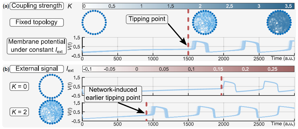 动力学网络的群体状态会在内外环境变化达到临界值时发生剧烈变化,导致它们从一个稳定状态突变至另一个截然不同的状态。此类临界值通常被称为复杂系统的突变点,数十年来受到了来自数学、物理、生物、医学、社会科学及人工智能等不同领域专家学者的广泛关注。复杂系统的状态突变,一方面可能会导致系统崩溃进而破坏系统功能,如生态系统的物种灭绝、基因蛋白质稳态丧失会引发疾病等,另一方面,复杂系统新状态的涌现也有助于创造新的系统功能,如大模型的涌现提升了任务性能、视交叉上核中神经元集群节律振荡的涌现调控了全身昼夜节律满足人体日常需求。因此,预测模型的突变点并阐明其潜在动力学机理有着重要的科学意义和应用价值。