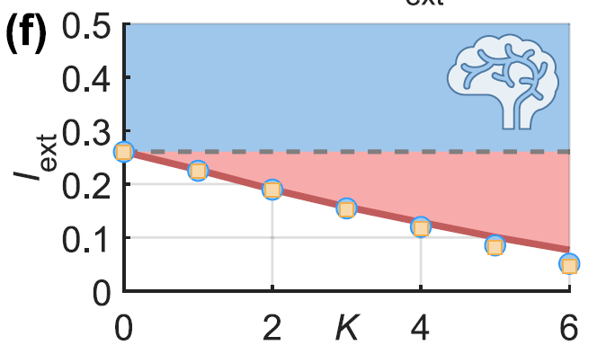 为解决这一问题,研究者在本工作中围绕图2中的动力学网络开展了系统性地分析,通过结合动力学降维方法与快慢系统摄动理论,建立了一套预测复杂系统脉冲振荡涌现临界点的计算框架。前者可以帮助研究者获得低维特征空间中的低维动力系统(图2),同时该系统还可以较为准确地刻画原复杂系统中的动力学行为。因此,基于此低维系统,可以进一步利用摄动方法对突变点做出精准的估计,研究者首先在神经元网络中验证了方法的有效性(图3)。