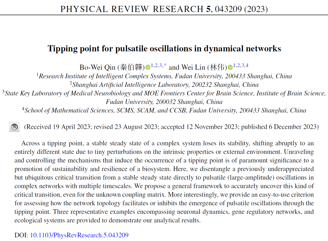 2023年12月6日,复旦大学智能复杂体系基础理论与关键技术实验室秦伯韡副研究员、林伟教授在Physical Review Research发表研究论文“Tipping point for pulsatile oscillations in dynamical networks”。该工作中,研究人员基于动力学理论构建了网络脉冲振荡涌现临界点的计算框架,并剖析了网络属性对复杂系统振荡涌现性的影响。