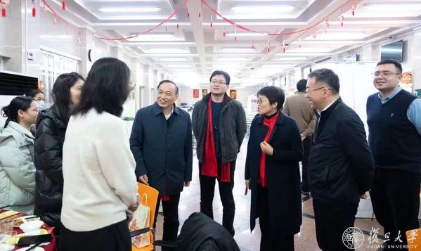 师生迎春会期间,郑锦、袁正宏、徐军,市教委学生处副处长俞冶论到民族餐厅与学生亲切交流。