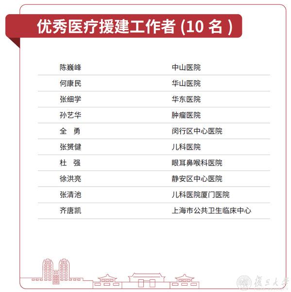 为大力弘扬医务工作者敬佑生命、救死扶伤、甘于奉献、大爱无疆的崇高职业精神,自2017年起,学校每年度组织开展复旦大学“十佳百优”(医务)评选活动,遴选复旦大学“十佳医务工作者”,以及复旦大学“优秀医生”“优秀青年医生”“优秀护士”“优秀医技工作者”“优秀医院管理工作者”“优秀医院后勤工作者”“优秀医疗援建工作者”“优秀医疗团队”“优秀医疗服务品牌”。今天,让我们看看这些复旦大学优秀医疗援建工作者的风采!