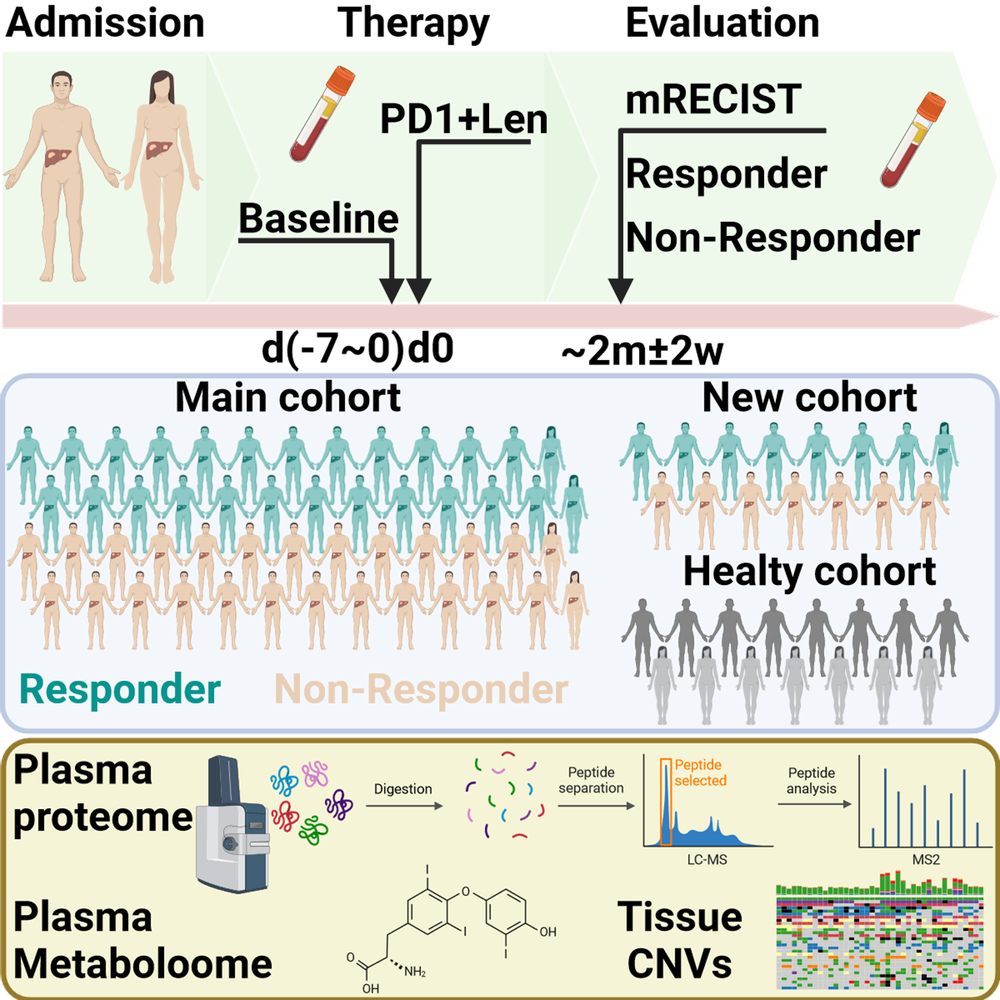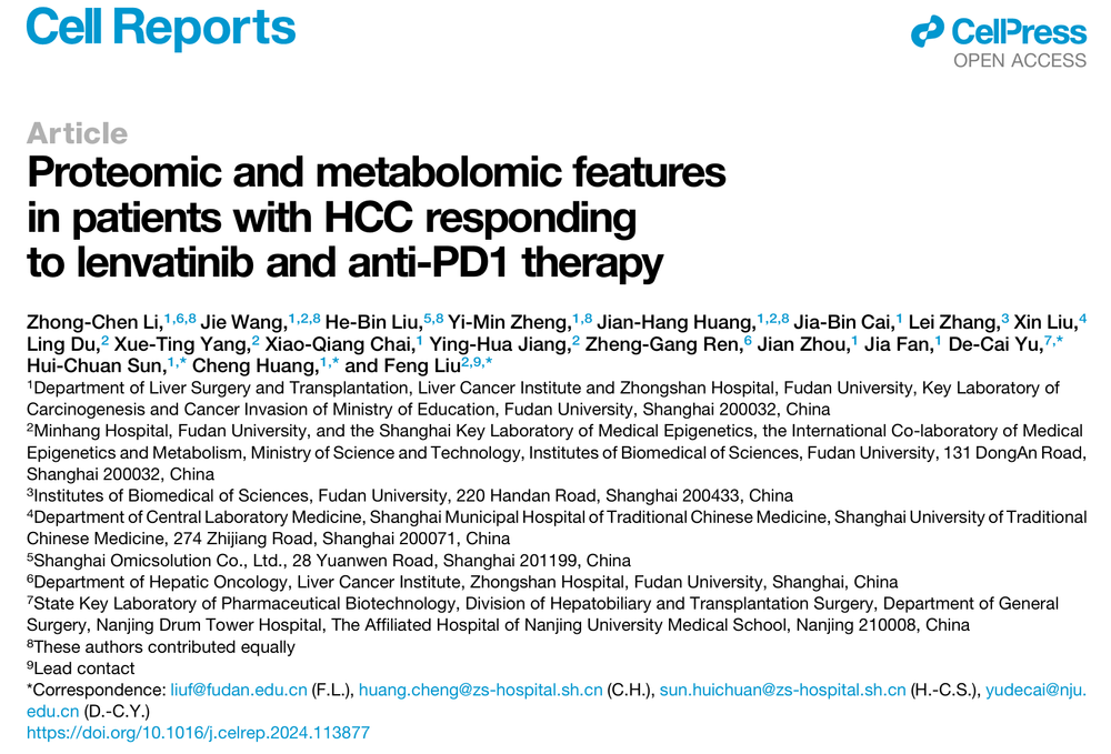 2024年2月27日,生物医学研究院刘锋团队与复旦大学附属中山医院樊嘉院士团队黄成教授和孙惠川教授合作,在Cell Reports上发表题为“Proteomic and metabolomic features in patients with HCC responding to lenvatinib and anti-PD1 therapy”的研究论文。该研究分析了对联合治疗敏感或不敏感晚期肝癌患者的血浆代谢组和蛋白质组特征,并利用全外显子测序分析了敏感或不敏感患者的肿瘤组织的体细胞突变谱。