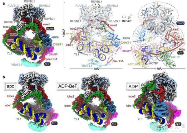 a. ADP-BeFx结合状态下SRCAP-C-核小体的复合冷冻电镜重构密度图及三维模型。b. 三种核苷酸结合状态下SRCAP-C-核小体的复合冷冻电镜重构密度图