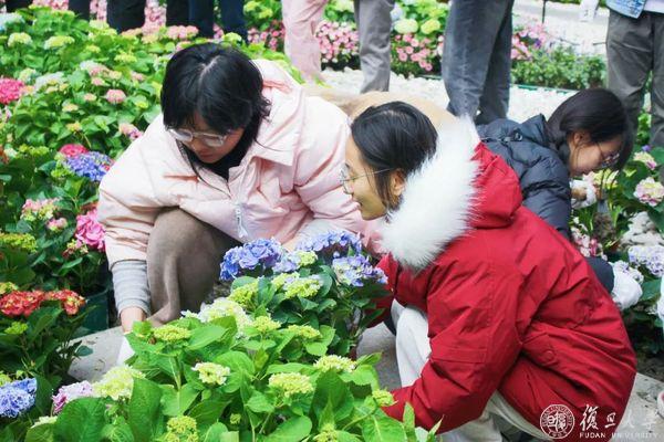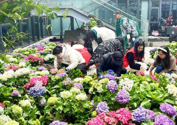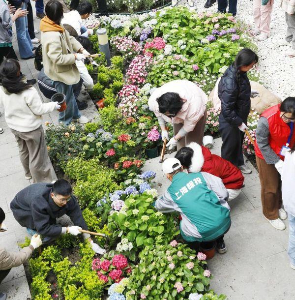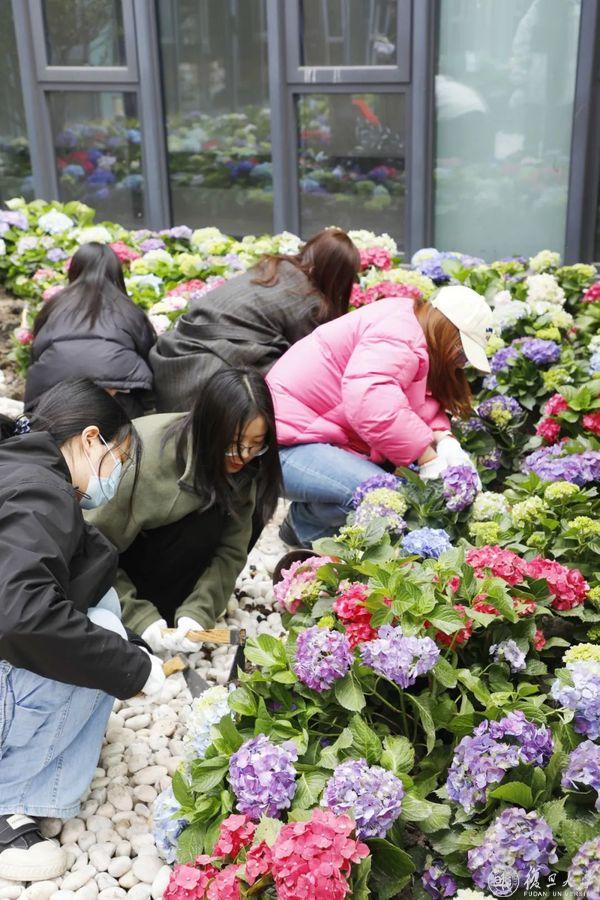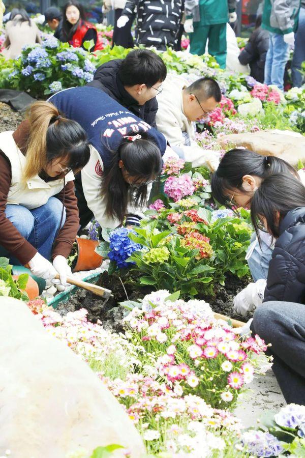 绿化养护专家尚玉山老师还在现场介绍了绣球花种植知识,并作教学演示。铲土造坑、培土围堰、提水浇灌……虽然这可能是很多同学第一次拿锄头、第一次用铁锹、第一次动手植树栽花,但是在师生们齐心协力下,一株株绣球花苗,一棵棵鲜嫩绿植在花圃中焕发活力。