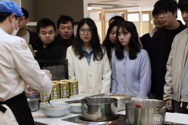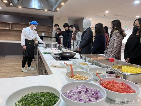 每个美食日的现场,大厨在介绍完,菜品所需的原料和调料后,便进行制作,同学们移步至厨房操作台,观看大厨现场教学。