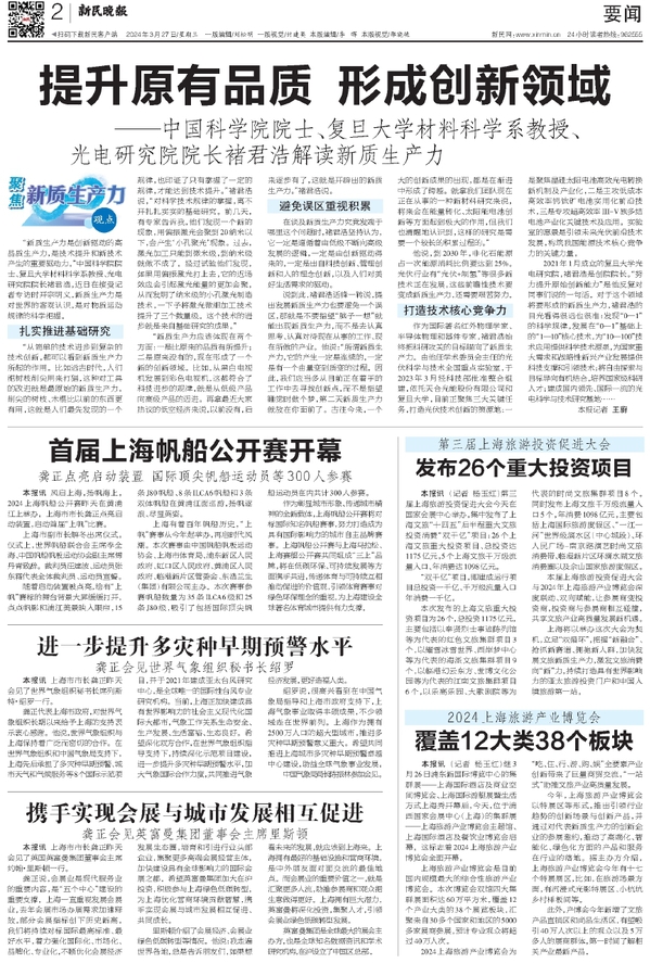 “新质生产力应该体现在两个方面:一是比原来的品质有所提升;二是原来没有的,现在形成了一个新的创新领域。比如,从黑白电视机发展到彩色电视机,这都符合了科技进步的规律,就是从低级产品向高级产品的迈进。再拿最近大家热议的低空经济来说,以前没有,后来逐步有了,这就是开辟出的新质生产力。”褚君浩说。