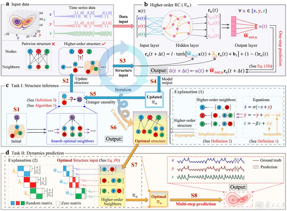 图1:HoGRC框架的示意图。a 观测时间序列和高阶结构作为模型输入数据。b 高阶RC新计算范式。c 高阶结构推断。d 基于推断的高阶结构的演化动力学预测