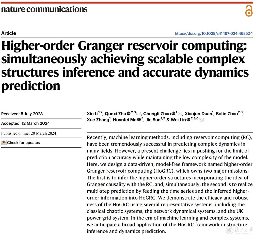 2024年3月20日,复旦大学林伟教授、朱群喜博士研究团队提出了一种基于格兰杰因果和储备池计算的轻量化机器学习框架,旨在高效且稳健地揭示系统高阶相互作用,并利用这些高阶结构信息进行精准动力学预测。这一研究成果以“Higher-order Granger reservoir computing: Simultaneously achieving scalable complex structures inference and accurate dynamics prediction”为题,在《自然通讯》杂志上发表,并选为应用物理与数学方向的featured article。国际知名学术网站techxplore.com以“Lightweight machine learning method enhances scalable structural inference and dynamic prediction accuracy”为题专文推送了该研究的介绍。