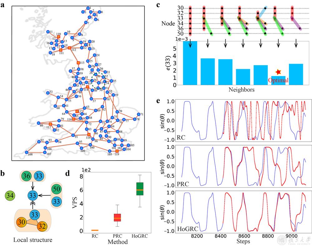图3:英国电网系统高阶结构推断和动力学预测。a 英国电网结构。b 节点33的高阶结构。c 节点33的高阶邻居推断过程。d RC, PRC和HoGRC方法对整个系统的平均可预测步数,箱线图含义同图2d。e RC, PRC和HoGRC方法对节点33的外推预测表现,其中蓝线表示真实值,红线表示预测值。