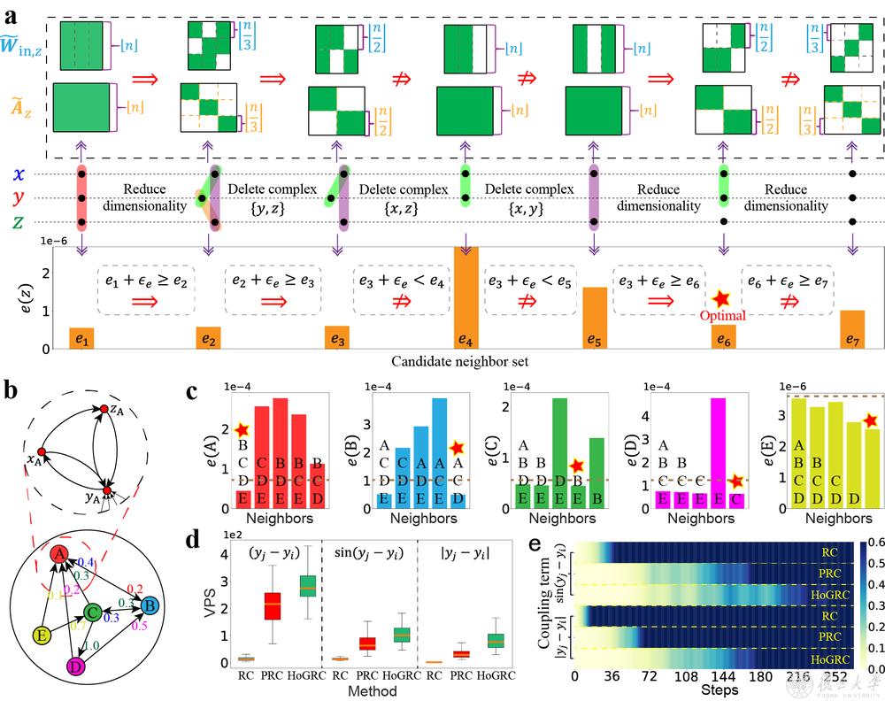 高阶邻居的过程,并且所推断出的最优结构与实际高阶邻居完全吻合。此外,团队还考虑了一个更高维的耦合洛伦兹系统,并在图2b中呈现了其耦合结构。类似的,研究团队基于格兰杰因果的思想在图2c中展示了耦合网络的推断过程,其中包含五个子图,分别表示子系统A-E在不同耦合邻居下的预测误差,进而推断出真实的耦合网络(用红色五角星标记了最优的耦合邻居)。最后,研究团队将经典RC方法和利用成对结构的PRC方法作为基线方法,并在图2d-e中展示了RC, PRC和HoGRC方法在不同耦合项情况下的预测表现。不难发现HoGRC框架相较于基线方法具有更强的预测性能。