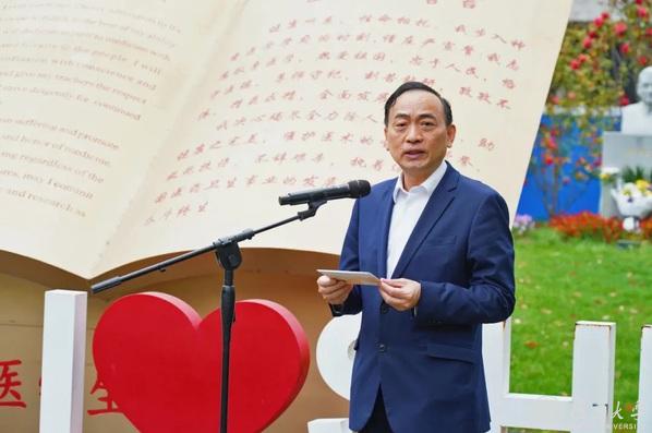 “救死扶伤,不辞艰辛,执着追求,为祖国医药卫生事业的发展和人类身心健康奋斗终生……”老领导代表、解剖学教授彭裕文带领学生重温医学生誓言,学生们身着白衣,庄重宣誓,将敬佑生命、救死扶伤、甘于奉献、大爱无疆的崇高职业精神牢记于心。