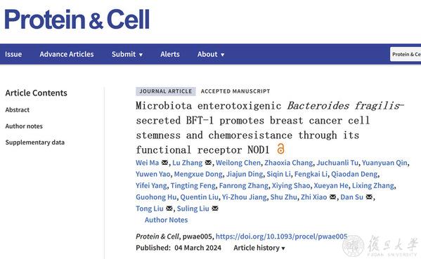 2024年3月4日,复旦大学生物医学研究院柳素玲团队在Protein & Cell杂志在线发表了题为“Microbiota enterotoxigenic Bacteroides fragilis-secreted BFT-1 promotes breast cancer cell stemness and chemoresistance through its functional receptor NOD1”的研究性论文,发现脆弱拟杆菌ETBF在化疗不响应的乳腺癌病人癌组织中富集,同时固有免疫受体NOD1在这些病人癌组织中高表达。该研究明确了肿瘤干细胞高表达的NOD1介导乳腺肿瘤细胞与菌群ETBF互作并导致乳腺癌多西他赛耐药的功能和具体分子机制,发现预测乳腺癌多西他赛耐药的分子标志物,并提出逆转乳腺癌多西他赛耐药的“三药联合”治疗策略。