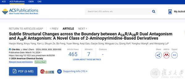 2024年3月14日,复旦大学药学院王永辉教授/谢琼副教授团队与华东师范大学生命科学学院卢伟强研究员课题组合作,在Journal of Medicinal Chemistry期刊上发表研究论文“Subtle Structural Changes across the Boundary between A2AR/A2BR Dual Antagonism and A2BR Antagonism: A Novel Class of 2 Aminopyrimidine-Based Derivatives”。该论文发现了一类新型吲哚类A2AR/A2BR双靶点小分子拮抗剂和A2BR选择性小分子拮抗剂,阐明了吲哚环的结构微小变化产生A2AR/A2BR双靶点活性或A2BR单靶点活性的原因和体外抗肿瘤机制。