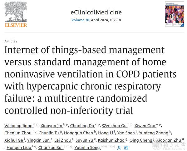 2024年3月10日,复旦大学附属中山医院呼吸与危重症学科的白春学、宋元林教授联合清华大学医学院廖洪恩教授于柳叶刀子刊《电子临床医学》(eClinicalMedicine)在线发表了题为《基于物联网管理的家庭无创正压通气治疗COPD合并慢性呼吸衰竭的多中心随机对照前瞻性研究》(Internet of things-based management versus standard management of home noninvasive ventilation in COPD patients with hypercapnic chronic respiratory failure: a multicentre randomized controlled non-inferiority trial)的研究成果。该研究创新地将物联网医学应用于使用家庭无创通气患者的居家疾病管理中,通过构建物联网慢病管理平台,实现了对患者相关参数的远程监测。通过设置预警指标,研究团队能早期识别潜在风险,并及时进行干预,为患者提供了院外延续性管理。
