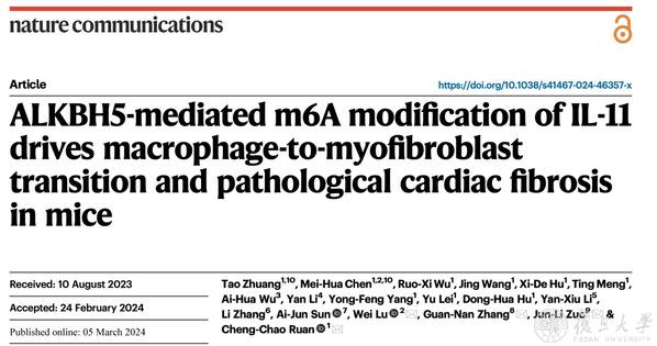 2024年3月5日,复旦大学基础医学院阮承超团队与合作者在《自然-通讯》(Nature Communications)期刊在线发表了题为“ALKBH5-mediated m6A modification of IL-11 drives macrophage-to-myofibroblast transition and pathological cardiac fibrosis in mice”的研究论文。该研究发现血管紧张素II诱导高血压模型中循环巨噬细胞转分化为肌成纤维细胞,巨噬细胞去甲基酶ALKBH5调节IL11 m6A修饰参与这一过程。