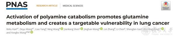 2024年3月21日,复旦大学基础医学院王勇波团队与美国罗格斯大学Wei-Xing Zong团队合作在《美国科学院院刊》(PNAS)发表了“Activation of polyamine catabolism promotes glutamine metabolism and creates a targetable vulnerability in lung cancer”。该研究揭示了肺癌中激活多胺分解代谢促进肿瘤细胞对谷氨酰胺的依赖,产生可靶向的脆弱性,为肺癌提供了潜在的联合治疗方案。
