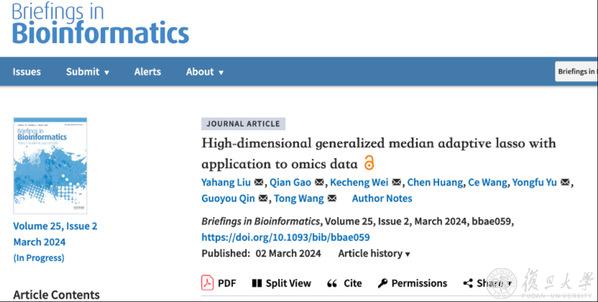 2024年3月2日,复旦大学公共卫生学院秦国友、余勇夫团队联合山西医科大学公共卫生学院王彤教授团队在生物信息学期刊Briefings in Bioinformatics上在线发表了题为“High-dimensional generalized median adaptive lasso with application to omics data”的研究论文。该研究提出了针对连续处理变量和离散处理变量的高维协变量选择和因果效应估计方法。GMAL方法可同时适用于连续处理变量和离散处理变量,为真实世界研究中高维协变量存在时的因果效应推断提供了新思路。