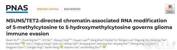 2024年3月28日,复旦大学基础医学院药理学系、教育部/卫健委/医科院医学分子病毒学重点实验室、上海市病原微生物与感染前沿科学研究基地束敏峰团队在《美国科学院院刊》(PNAS)上发表了题为“NSUN5/TET2-directed chromatin-associated RNA modification of 5-methylcytosine to 5-hydroxymethylcytosine governs glioma immune evasion” 的研究论文。该研究发现了NSUN5/TET2/RBFOX2轴调控染色质相关RNA代谢的普适规律,揭示了胶质瘤免疫逃逸的新机制,并提出靶向NSUN5是胶质瘤免疫治疗的潜在策略。在此基础上,进一步筛选到逆转胶质瘤免疫逃逸的小分子药物。
