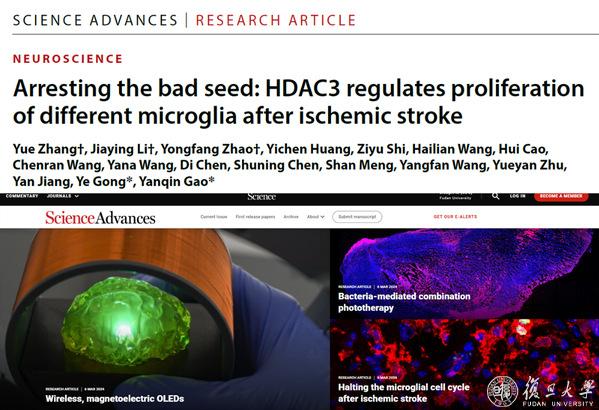 2024年3月6日,复旦大学脑科学研究院高艳琴团队在《科学进展》(Science Advances)上发表了题为《阻止坏种子:HDAC3调节缺血性脑卒中后不同小胶质细胞的增殖》(Arresting the bad seed: HDAC3 regulates proliferation of different microglia after ischemic stroke)的研究成果。该研究为缺血性脑卒中靶向抑制小胶质细胞 HDAC3的精准治疗提供理论基础。