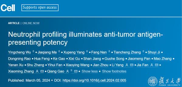 2024年3月5日,复旦大学附属中山医院院士樊嘉和教授高强、中国科学院上海免疫与感染研究所研究员张晓明、复旦大学生物医学研究院研究员杨力合作在Cell上发表了题为“Neutrophil profiling illuminates anti-tumor antigen-presenting potency”的研究论文,利用自测数据(79.29%)和公共数据(20.71%),基于肝癌、胆管癌、胆囊癌等17个癌种的143例患者共计225例样本的中性粒细胞单细胞转录组,系统性揭示了人源肿瘤相关中性粒细胞的表型多样性和可塑性(如抗原提呈型、促血管新生型、炎症型等),发现HLA-DR+CD74+中性粒细胞在多个癌种和患者预后正相关,可诱导T细胞抗原特异反应并促进形成“热肿瘤”微环境,可作为潜在的免疫治疗增敏策略。