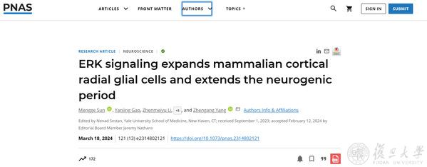 2024年3月18日,复旦大学脑科学研究院/附属中山医院杨振纲团队在《美国科学院院刊》(PNAS)期刊发表“ERK signaling expands mammalian cortical radial glial cells and extends the neurogenic period”文章,揭示了哺乳动物在进化过程中大脑皮质神经元数量不断增加的机制。这些结果显示人类大脑皮质包含更多的神经元,提示人类大脑有更强的信息处理能力,这可能是人类智力高于动物智力的原因之一。