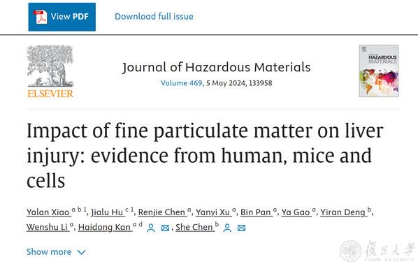 2024年3月4日,复旦大学基础医学院陈舌团队与复旦大学公共卫生学院阚海东团队联合在环境领域期刊Journal of Hazardous Materials杂志上发表了题为“Impact of fine particulate matter on liver injury: evidence from human, mice and cells”论文。研究通过综合人群、动物和体外实验的证据,全面探讨了环境PM2.5暴露对肝损伤的影响及其潜在机制,丰富了PM2.5的肝毒性效应谱,首次从细胞极性改变的角度阐明了PM2.5诱导肝损伤的潜在分子机制,为未来PM2.5毒作用机制的研究提供了新的方向。