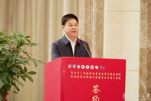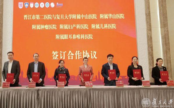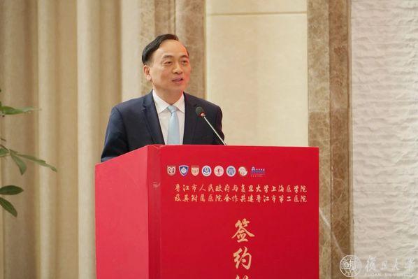 下午,复旦大学上海医学院与晋江市人民政府正式签署合作共建晋江市第二医院协议,成立复旦大学上海医学院晋江医学发展中心。泉州市委常委、晋江市委书记张文贤,晋江市委副书记、市政府副市长吴志朴,晋江市委常委、市政府副市长张健龙,泉州卫健委主任苏松炎等出席签约仪式。