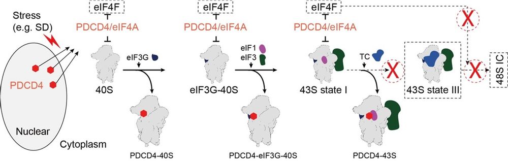细胞中的蛋白质翻译是一项基本的生物学过程,它将RNA中的遗传信息转化为功能性蛋白质,从而实现细胞的正常功能和活动。在这一过程中,翻译的起始阶段被认为是至关重要的,因为它涉及大量能量和时间。在真核细胞中,这一过程始于43S前起始复合物(PIC)的组装,其中包括40S核糖体、eIF1、eIF1A、eIF3复合物、eIF5以及eIF2三聚体复合物(TC)。在正常的生长条件下,这一过程能够顺利进行,确保了蛋白质的正常合成和细胞的正常功能。然而,在面对外界压力或应激条件时,细胞会采取各种机制来抑制翻译的起始过程,以适应不同的环境条件。尽管我们已经了解到了一些抑制翻译的机制,但还有许多详细分子机理仍然不清楚。