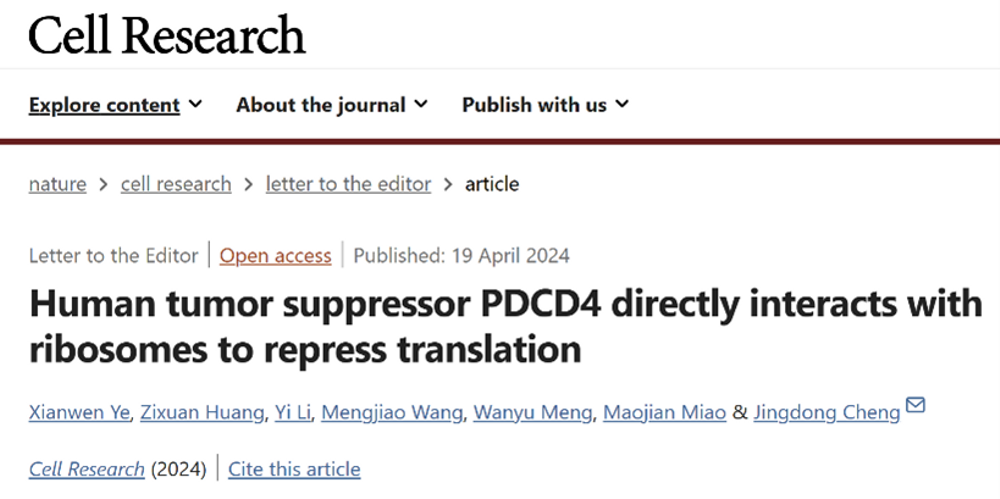 2024年4月19日,复旦大学生物医学研究院程净东课题组在Cell Research在线发表了题为“Human tumor suppressor PDCD4 directly interacts with ribosomes to repress translation”的研究论文。在这项最新的研究中,他们聚焦于一类重要的肿瘤抑制因子——PDCD4,并详细阐明了其在翻译调控过程中发挥的新作用机制。