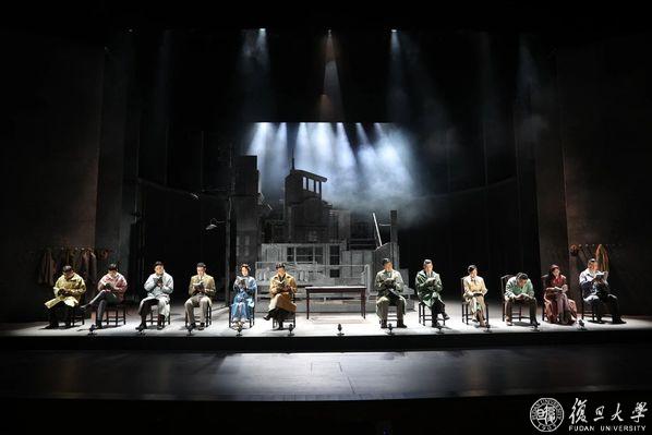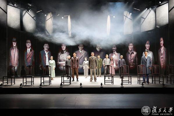 相辉堂。伴随着话剧《千里江山图》大幕拉开,复旦师生仿佛重回上世纪三十年代的上海,沉浸式感受那些隐姓埋名、在黑暗中点燃火炬的英雄故事。话剧采用叙事体的形式,舞台上,一群阅读小说的当代青年渐渐化为书中人物,并不断在两者间穿梭。演员用生动的表演力,充盈而磅礴的情感逐渐将剧情推向高潮,更让原著中的人物栩栩如生。为了在舞台上实现小说中“移步换景”式的叙事转场,话剧《千里江山图》利用虚实结合,同时通过装置组合与转台设计,为场景的切换和舞台动线提供更多灵活性。