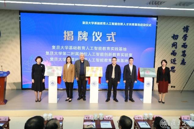 与会嘉宾共同为“复旦大学基础教育人工智能创新人才共育基地” “复旦大学基础教育人工智能教育实践基地”“复旦大学计算机学院人工智能教育实践基地”“复旦大学第二附属学校人工智能创新教育实验室”揭牌,通过共建相关平台,将为大中小学师生提供更广阔的人工智能学习和实践平台。