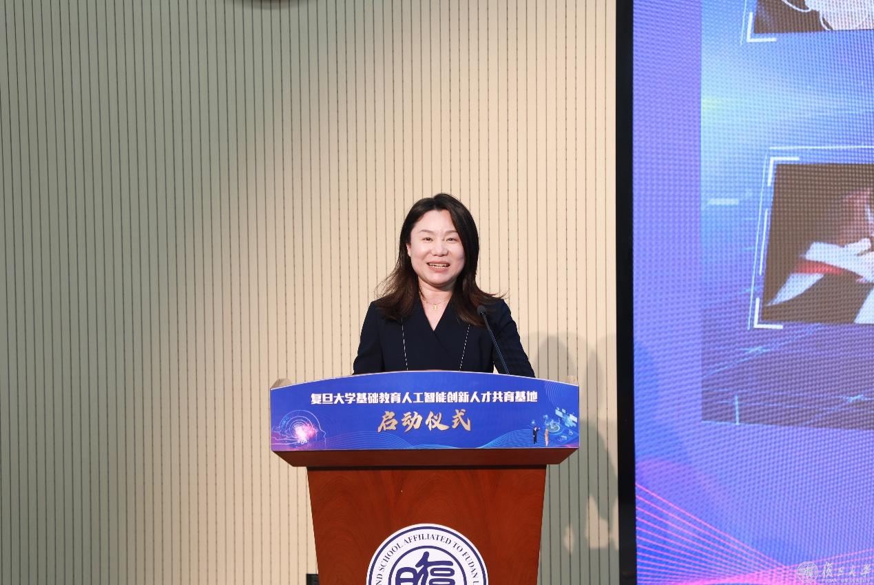 汪源源在致辞中强调复旦大学肩负着推动人工智能与教育的深度融合,促进教育范式的变革,赋能创新人才培养的责任和使命。他充分肯定了第二附属学校在人工智能教育方面取得的成绩,希望通过整合大学和附属学校的优势资源,共同打造“复旦大学基础教育人工智能创新人才共育基地”,探索面向未来的中小学人工智能教育新范式,为创新人才培养积累新经验。