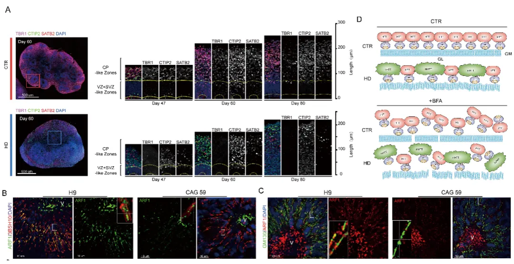 为了进一步研究HD皮层发育受损的潜在机制,研究人员将目光转向hCO神经前体细胞区域(神经管样区域)中,发现了这个区域polyQ组装体的富集具有一定的方向性,并可引导高尔基体结构并分拣clathrin+囊泡;他们进一步推测高尔基体结构通过 ADP 核糖基化因子 1(ARF1)连接 polyQ 组装体,并使用Brefeldin A (BFA)对于ARF1活化的抑制证明了这一点,BFA的干预可使高尔基体中与 polyQ 组装体解离。
