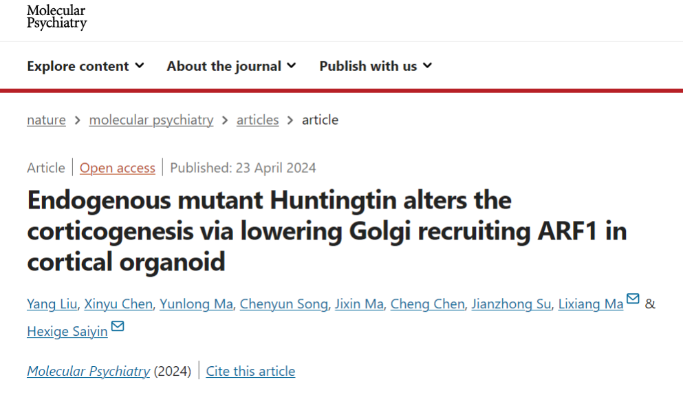 2024年4月23日,复旦大学基础医学院解剖与组织胚胎学系马丽香与生命科学学院赛音贺西格联合课题组在应用脑类器官研究HD疾病新的机制方面取得了新进展,相关研究成果以“Endogenous mutant Huntingtin alters the corticogenesis via lowering Golgi recruiting ARF1 in cortical organoid”为题在线发表在《分子精神病学》(Molecular Psychiatry)杂志上。