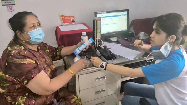 凯日玛(右一)在喀什市阳光小区社区卫生服务站进行健康咨询工作