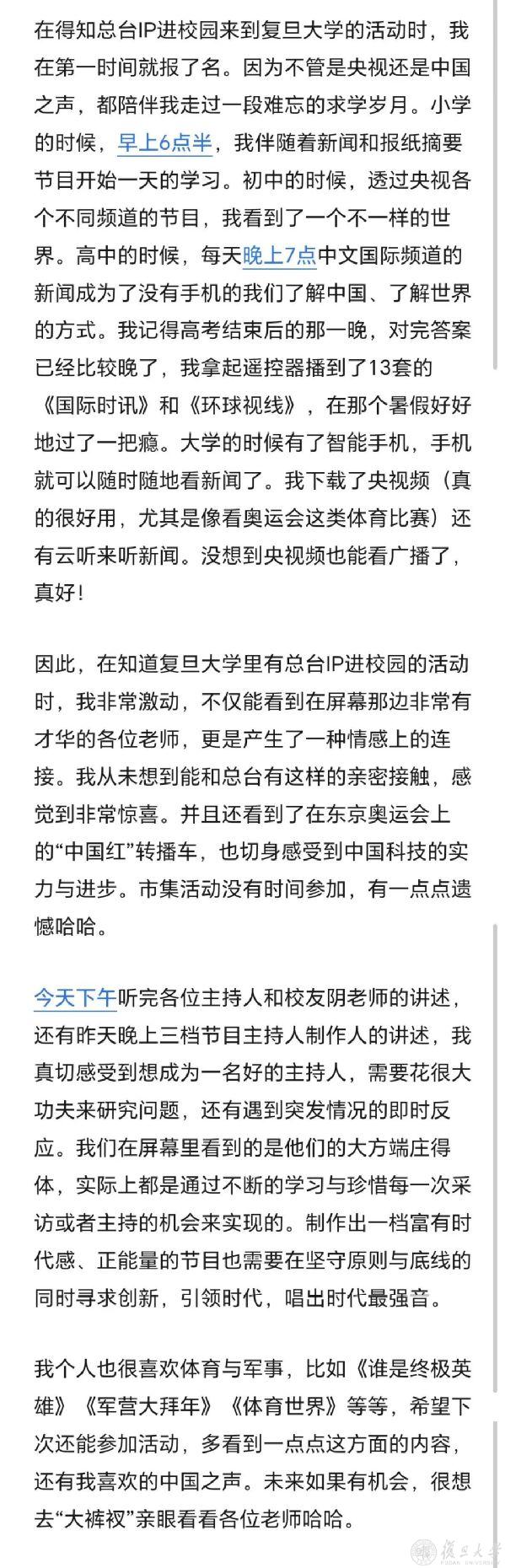 “得知总台IP进校园活动来复旦,我第一时间就报了名,不管是央视还是中国之声,都陪伴我走过一段难忘的求学岁月。”