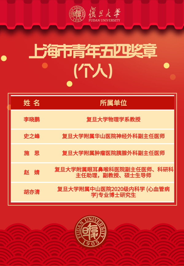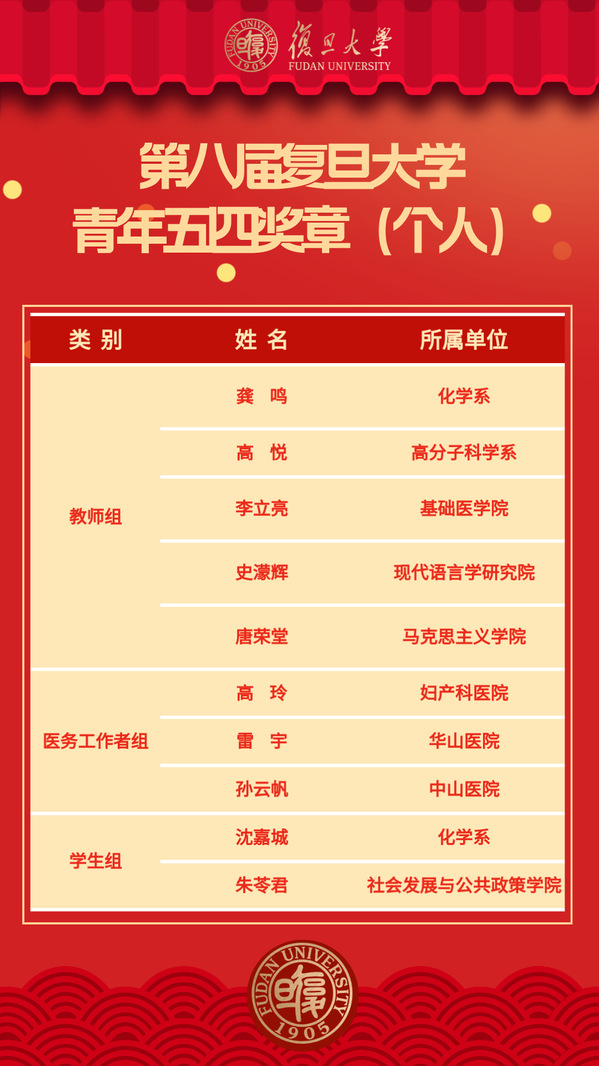 第八届复旦大学青年五四奖章(个人)名单