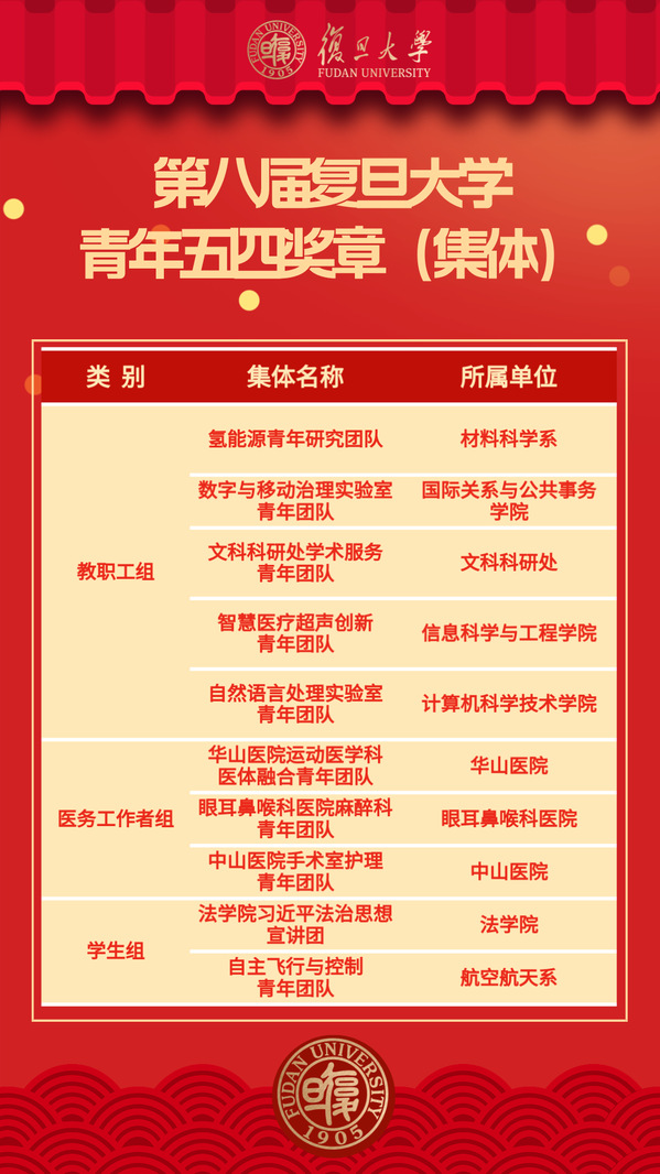第八届复旦大学青年五四奖章(集体)名单