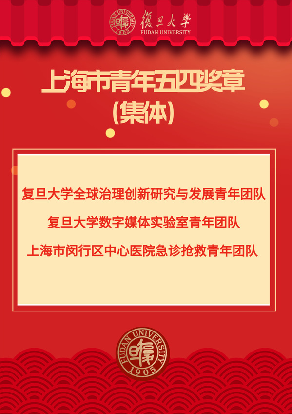 为树立典型、表彰先进,2023年度上海市青年五四奖章集体名单、2023年度上海市青年五四奖章个人名单揭晓。日前,经单位推荐、通讯评审、资格审查、终审答辩等环节,评选出第八届复旦大学青年五四奖章(个人)、第八届复旦大学青年五四奖章(集体)。