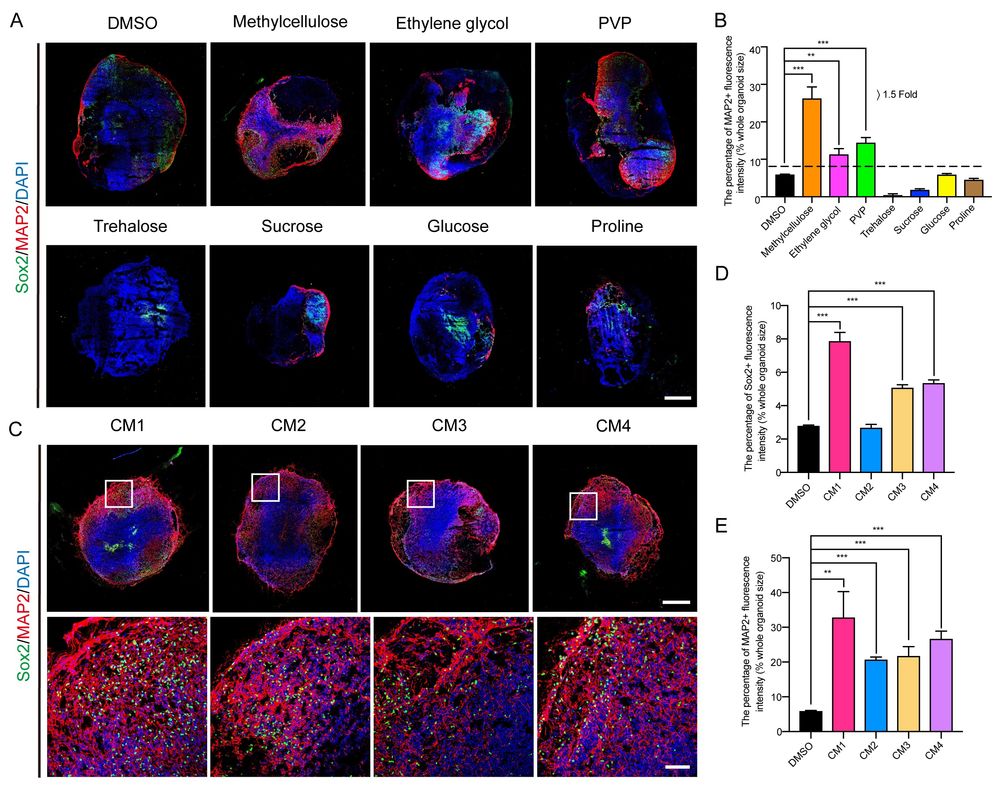 图2:不同冷冻保存介质对复苏后脑类器官的影响