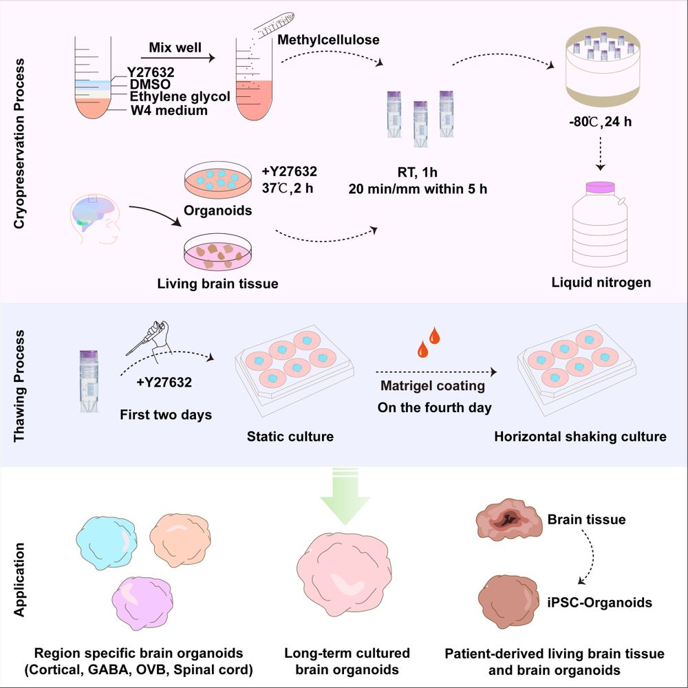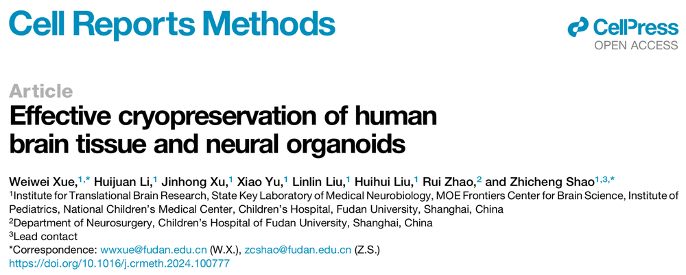 随着类器官技术的进步,脑类器官在研究人类大脑发育、脑疾病建模和开发新药方面显示出巨大的潜力,脑类器官对于研究和模拟人类神经系统疾病至关重要。然而,脑类器官的培养周期长,成本高,极大限制了它们在生物医学研究中的应用。携带病理特征的新鲜人脑组织是研究神经系统疾病更为可靠的模型。目前,具有特定病理特征的脑组织可获取性,可操控性以及低温保存神经活性都面临很多技术难题。冷冻保存技术已在胚胎干细胞、配子、胚胎、胶质母细胞瘤类器官、子宫内膜器官等方面广泛应用,极大助力再生医学的发展。脑类器官/脑组织是由多种神经细胞构成的复杂结构,具有神经功能网络活动,二维细胞和非神经类器官的冷冻方法不适用于神经类器官和人脑组织。因此,开发脑类器官/脑组织的低温保存方法,对推动脑科学基础和临床转化研究具有重要意义。