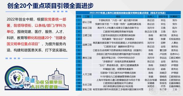 根植于上海市第一家公立口腔医疗机构的文化底蕴,口腔医院致力于用习近平新时代中国特色社会主义思想教育人,用社会主义核心价值观培育人,形成医院建设发展的精神支柱和精神动力。进入“十四五”以来,通过创全八大工程和58个具体项目、20个重点项目的实施,更加主动地提升软实力,助推医院高质量发展。项目推进率达到了100%,完成率达到85%。在精神文明建设和创全的过程中,项目制的实施能成为一种有效的管理方式——有效整合资源、明确各自目标、确保实施效果。通过精心策划和组织,项目制可以将社会主义核心价值观理念转化为具体的实践活动,把各项任务项目落到实处,全力提升管理模式、诊疗模式、运行模式和服务模式,达到去虚向实的效果,汇聚起全体干部员工的智慧与才干,充分发挥出软实力的“加速器”作用,为建设员工幸福、患者满意,高质量可持续发展的研究型医院而奋勇前进。