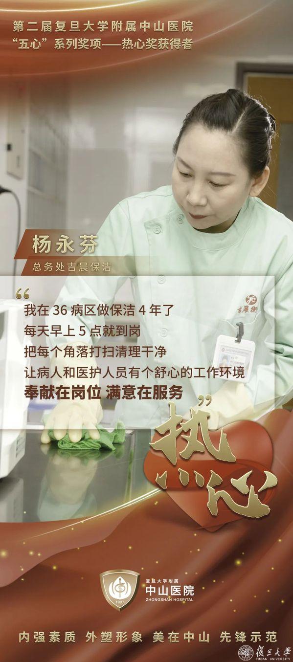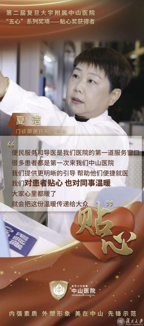 2021年,中山医院以建党百年为契机,深入学习宣传贯彻习近平新时代中国特色社会主义思想,践行社会主义核心价值观,紧紧对标医院高质量发展,聚焦“严谨、求实、团结、奉献、创新、关爱”的核心价值观,创新医院文化建设,面向全体医务人员,凝练出“五心”服务理念,即仁心、爱心、细心、热心、贴心,让每一名医务人员从“心”出发,上下齐心、仁心仁术、暖心关爱,让每一位患者更安心、更放心、更舒心。为弘扬医务工作者全心全意为人民服务的“五心”服务理念,医院每两年开展“内强素质 外塑形象”——五心系列奖项评选活动(2021年为首届评选),包括仁心奖、爱心奖、细心奖、热心奖、贴心奖、文明窗口、文明服务品牌等。医院的“五心”服务理念得到了全院医务人员的高度认可和积极践行,激发了医院文化的生命力,为推动医院的高质量发展培根铸魂。