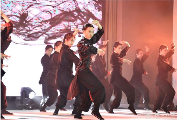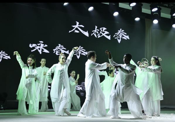 铿锵有力的武术动作、灵活多变的手法步型,武术与舞蹈《中华韵》在阵阵喝彩中拉开帷幕。站姿挺拔的各国学生们以整齐划一的队形动作,于行云流水的招式间展现中国武术的独特魅力。