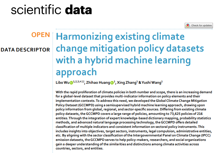 6月4日,Nature子刊Scientific Data正式上线了一篇题为“Harmonizing existing climate change mitigation policy datasets with a hybrid machine learning approach”的论文,一个涵盖七万多条政策的全球规模最大的气候政策数据库也同步向全球公开。这是复旦大学大数据学院吴力波教授带领的研究团队,历时三年研发的全球最大规模的气候变化减缓政策数据库(Global Climate Change Mitigation Policy Dataset,简称GCCMPD)。