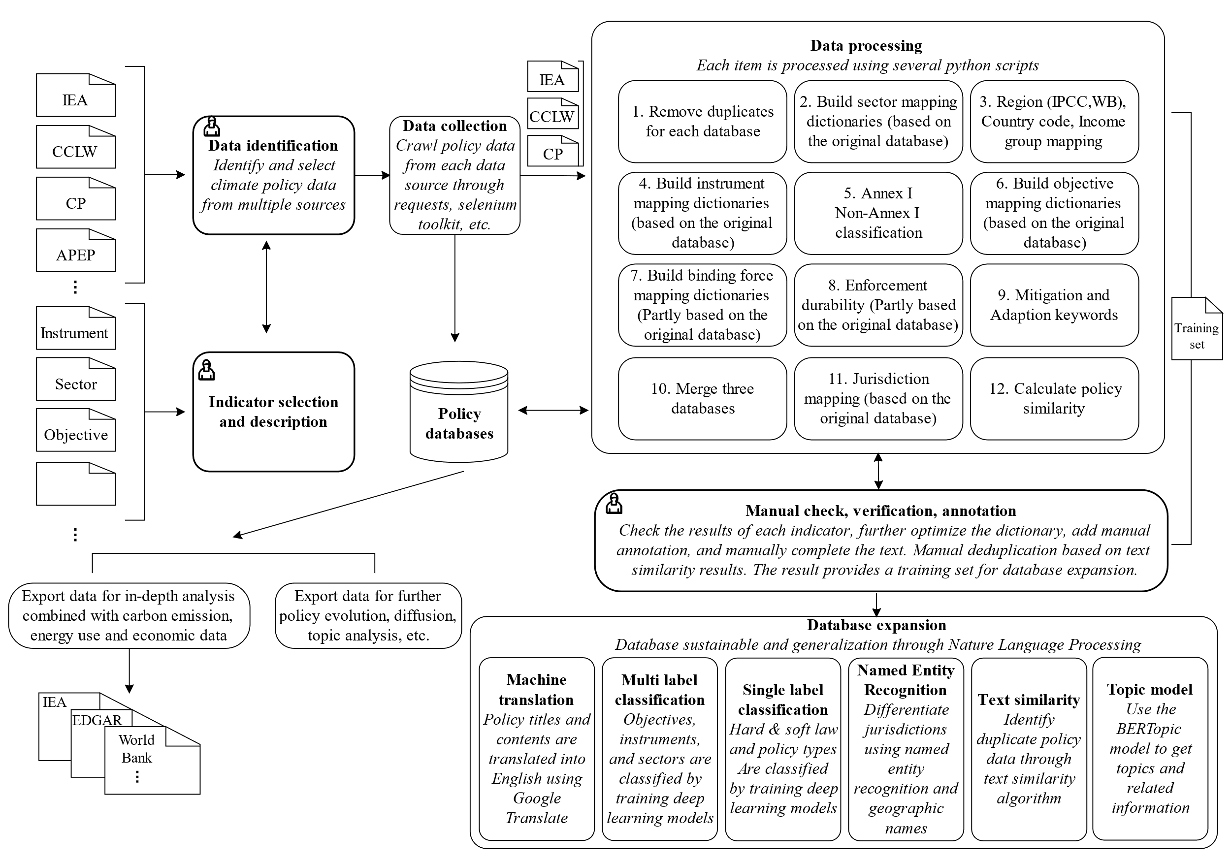 为此,吴力波研究团队使用多层流程提供了从数据识别、数据采集、数据处理、人工核查,再到数据拓展以及相关可能应用的统一方法学框架。通过自动化的数据工程,汇集全球数据集、区域数据集、专注于技术、政策工具和立法等专业领域的数据集等多重数据来源,解决了当前气候政策数量、覆盖范围不足的问题。