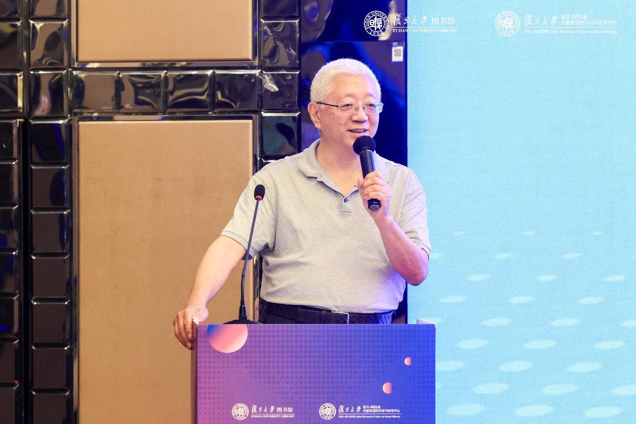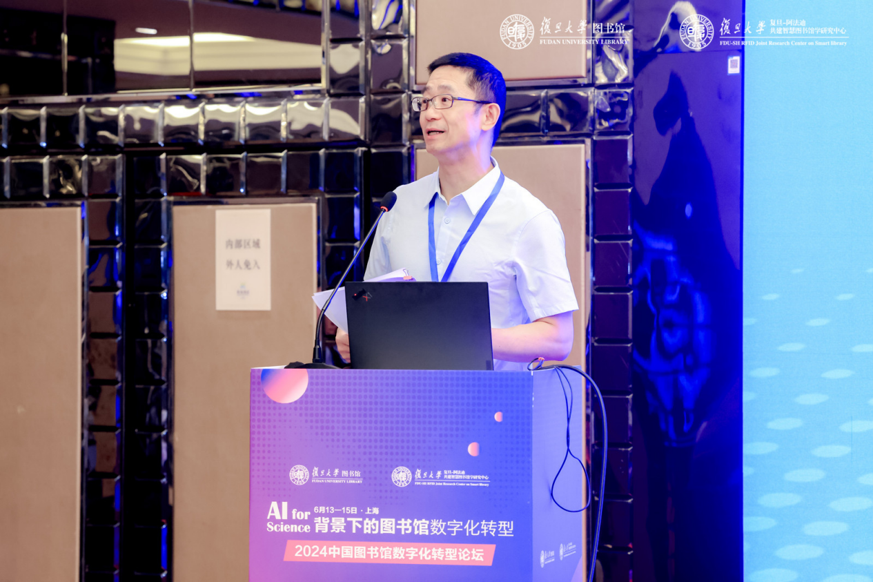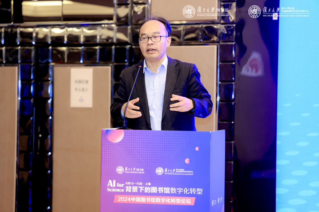 陈志敏代表复旦大学对各位代表表示热烈欢迎。陈志敏指出,人工智能的蓬勃发展将为科研领域带来新质生产力,助力实现中国式现代化。他对图书馆数字化转型提出了四点展望:一是图书馆要建设自己的专题数据库,助力垂直领域的AI应用开发;二是图书馆数据资源要服务教学和科研;三是通过与政府、企业等进一步合作,共享数据资源和算力,为教学科研提供支撑;四是在图书馆业务领域开发垂直领域大模型,全面提升图书馆的能力。